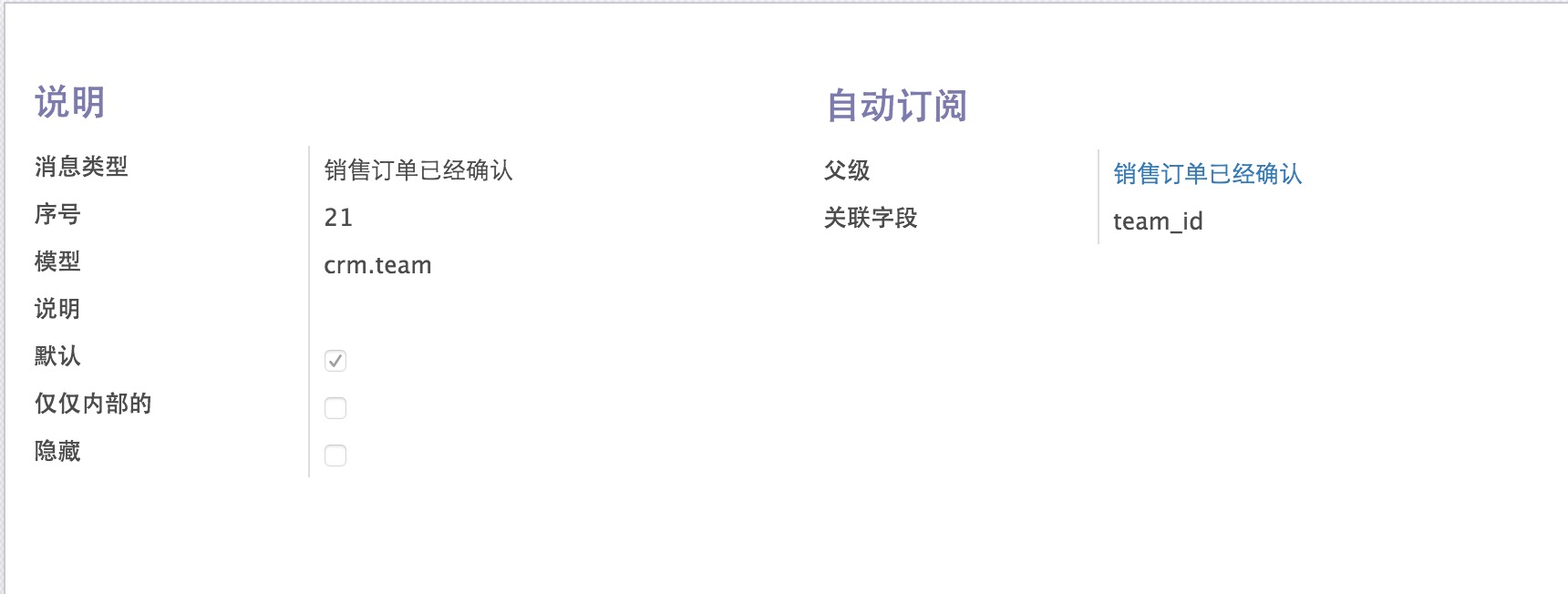子类型的配置菜单(设置/技术/邮件/子类型),打开其中一个子类型,例如:模型是crm.team,名字为“销售订单已经确认”的子类型,模型:销售团队(crm.team)表示是这是一个定义在销售团队的子类型,右边的自动订阅下有2个字段:父级、关联字段: